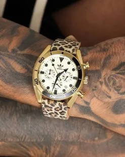 A classic piece, the Edition Two Icon is the watch to finish dressing up an outfit, or pop on as you’re running errands for a put-together look. The stainless steel band meets an analog quartz design, with a leopard print leather strap and gold case and dial. Quality made for you.
