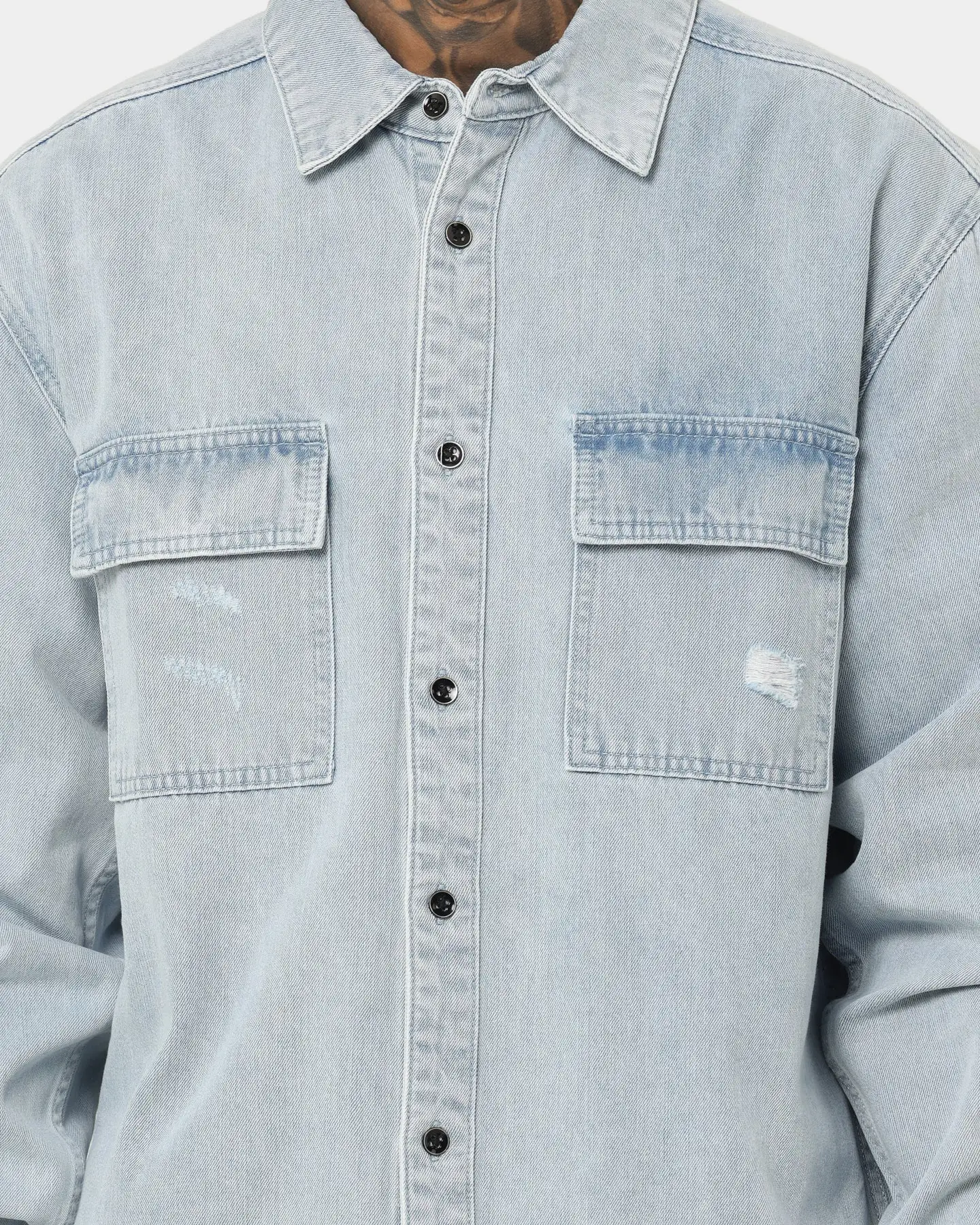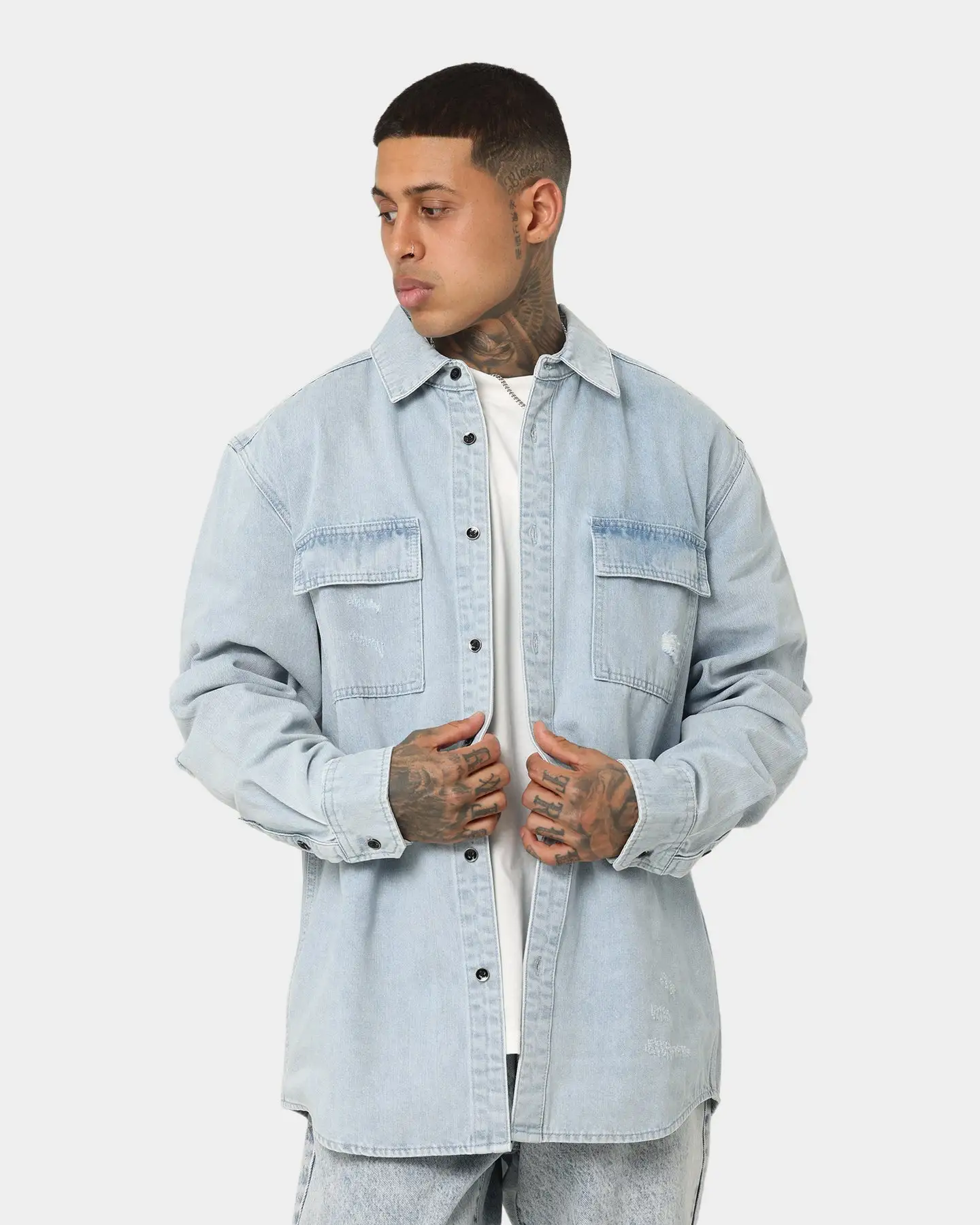 The Nevada Denim Shirt is the button up shirt you need. With washed denim and distressing details, in a casual oversized fit, this shirt elevates any outfit you throw this on with.