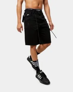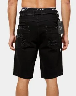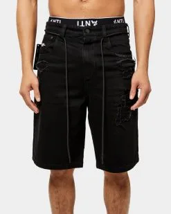 The Post War Denim Shorts are a heavily distressed denim piece with a dark twist. Featuring doubled rear pockets and signature Antri Order branding.