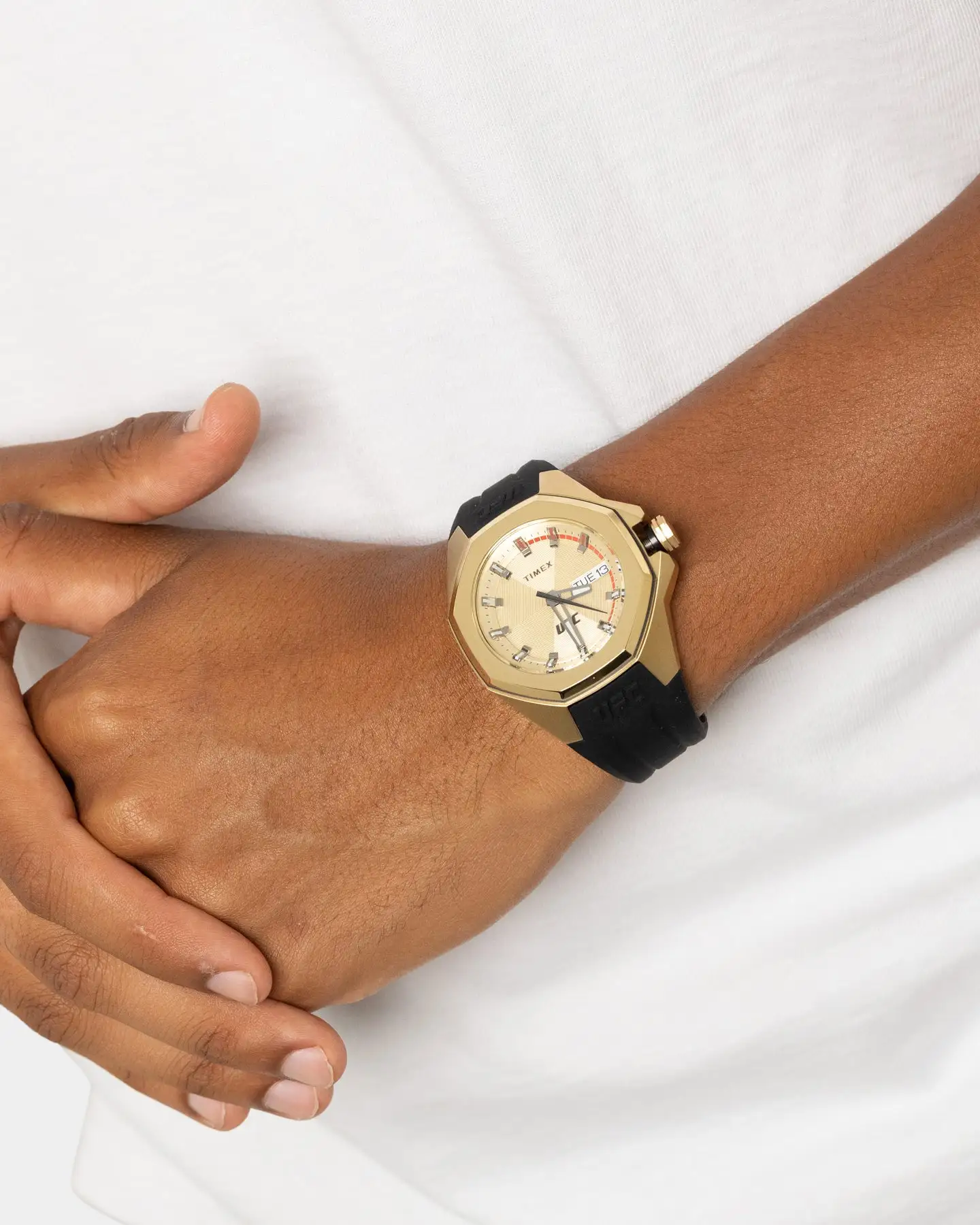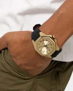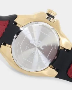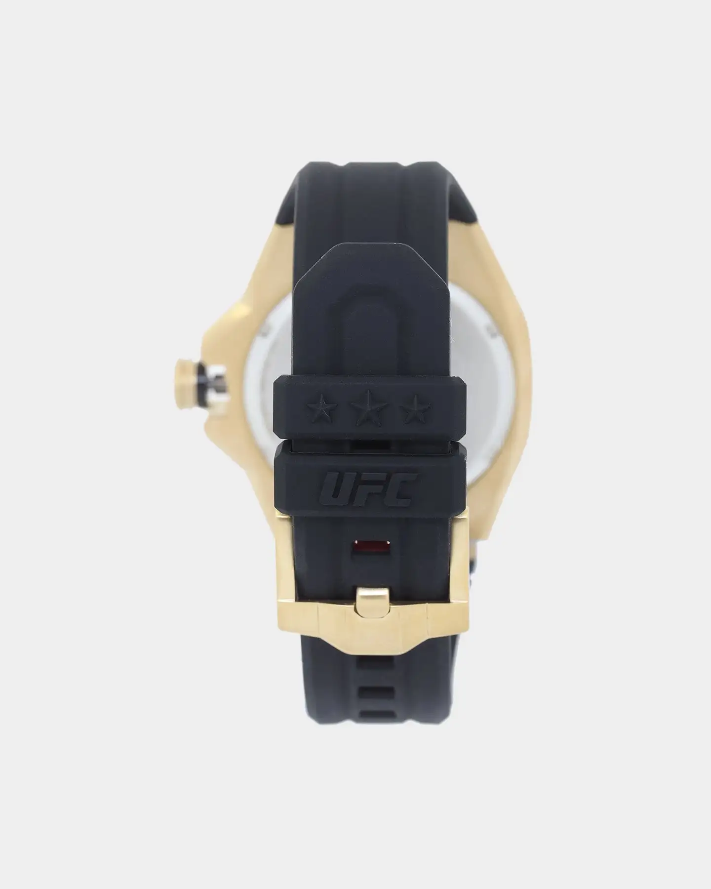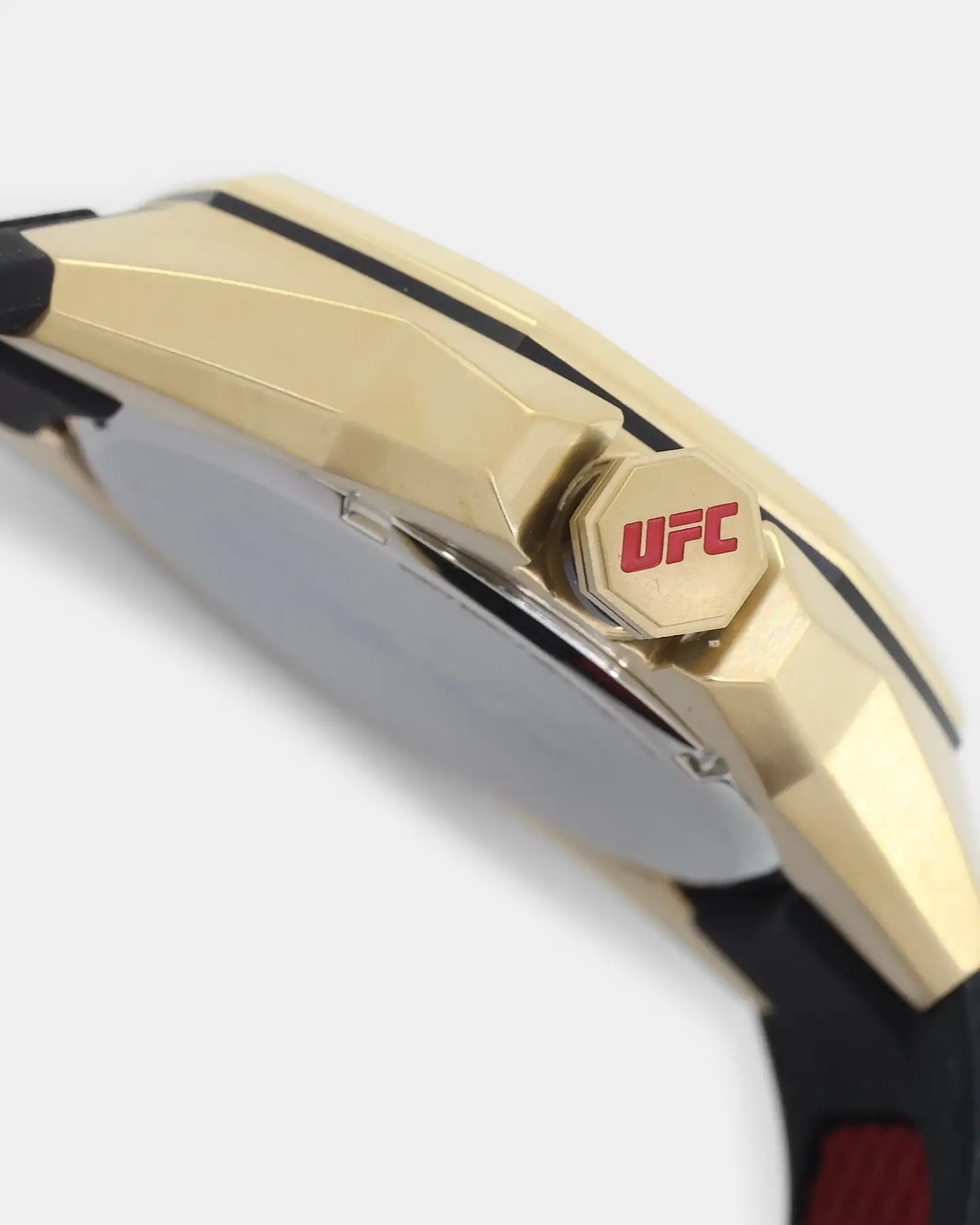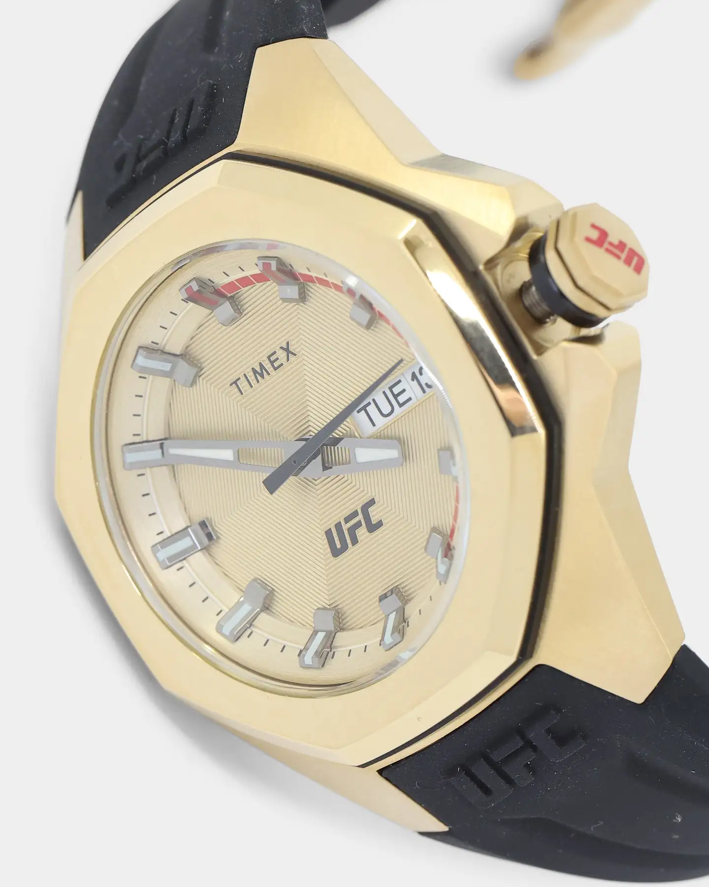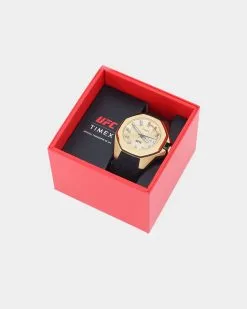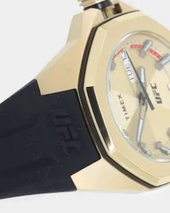 Showcasing hard lines and sleek architectural design, the TIMEX UFC Pro is a premium analog statement piece for any wrist. This watch reps authenticity with pride, from the line-embossed UFC logo on the gold-tone dial and comfortable black band, to the expert construction of the octagonal bezel and enamel-inlayed crown. A date indicator sits within the textured multi-layered dial, while its gold-tone stainless-steel case weighs in at a substantial 44mm and 100m of water resistance for rugged durability.
